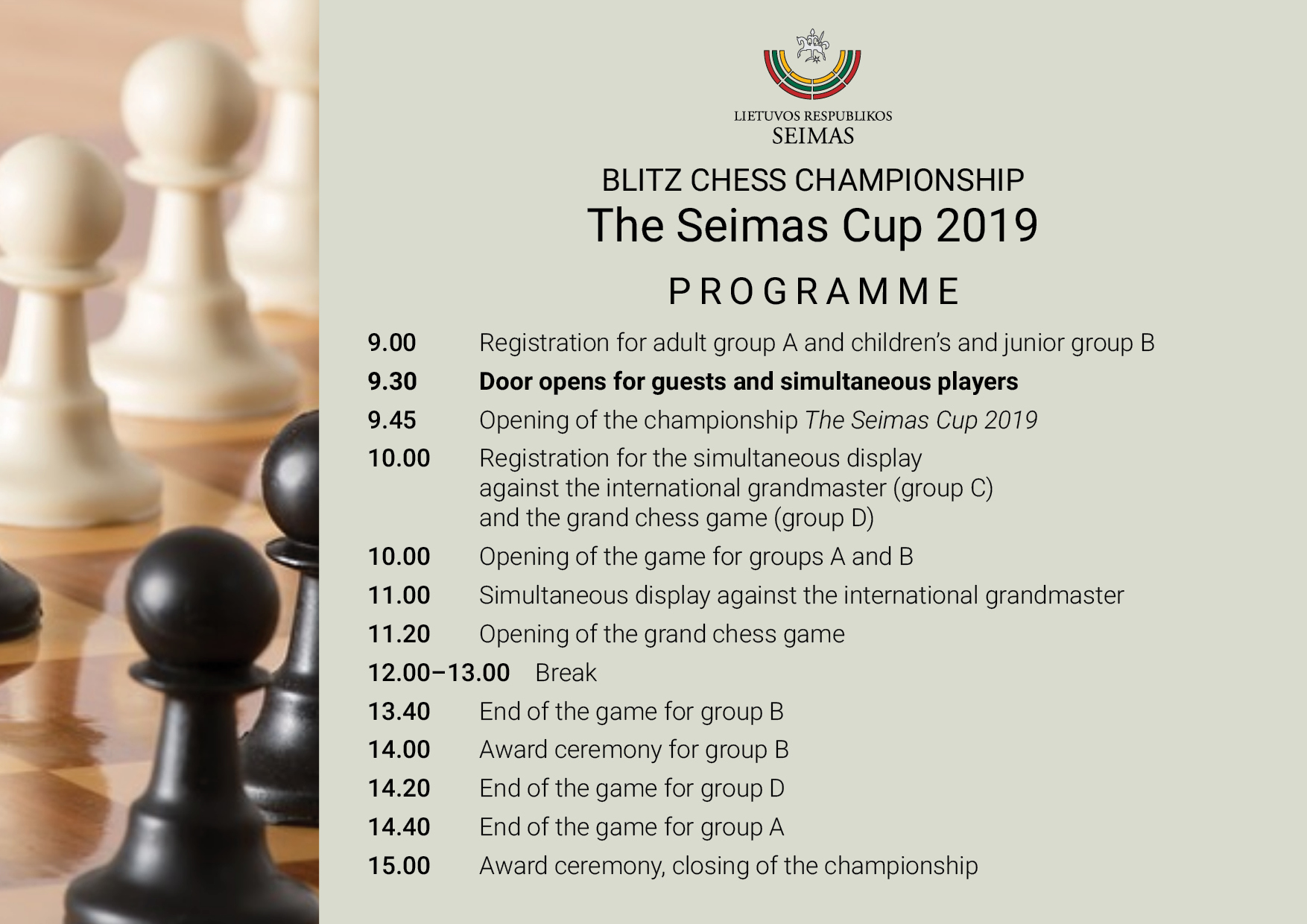 On 9 March, Saturday, from 9.45 to 16.00, the traditional chess championship Seimas Cup 2019 will bring together amateurs and professionals at the chess table for the 25th time. The Seimas will open its doors for viewers and participants in the simultaneous display from 9.30 (entry at the security checkpoint in Building 1 of the Seimas).